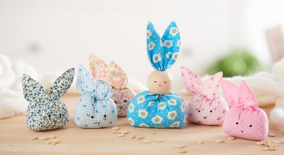 Nyní je třeba zajíčka naplnit vatou a poté otvor mezi ušima ručně zašít, např. žebříčkovým stehem. Nakonec vezměte dřevěnou kuličku a nakreslete na ni roztomilý obličej zajíčka. Pak už jen stačí provléknout uši dřevěnou kuličkou a vytvarovat je.