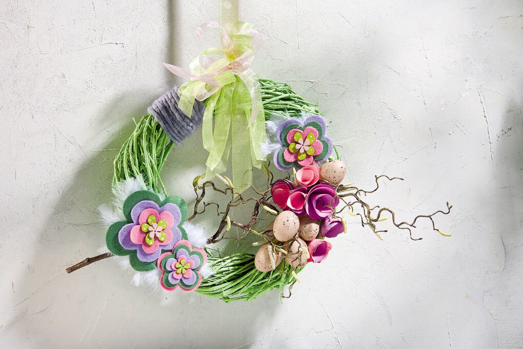 Tento velký zelený vrbový věnec je zdobený barevnými plstěnými květy a kroucenými květy z dřevotřísky. Jasné barvy harmonicky doplňují realistická vajíčka a větvička.