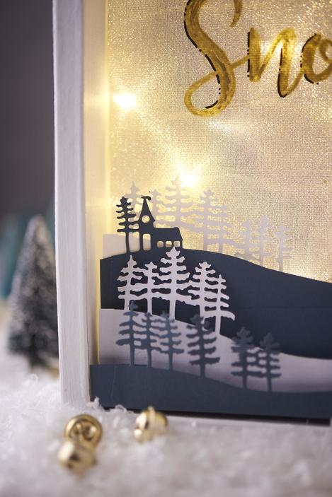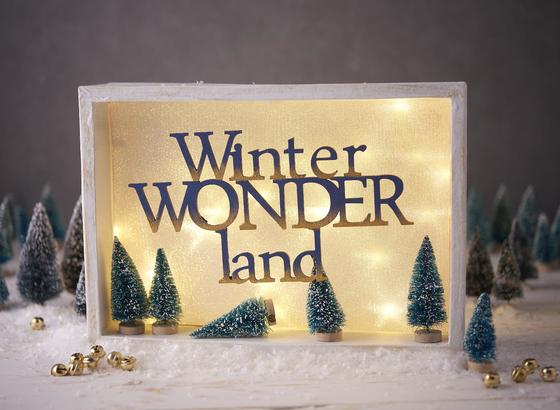 natřete dřevěný nápis Winter Wonderland. Zavěste jej do kartonového rámu pomocí nylonové nitě a upevněte jej na místě.