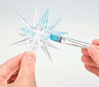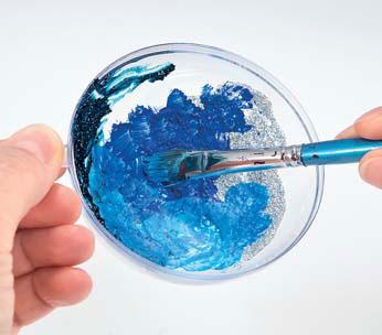 Po zaschnutí natřete dekorativní sníh tyrkysově modrou řemeslnou barvou a potřete třpytivou pastou v barvě měsíčního kamene. Dno skleněné misky pokryjte diamantovým sněhem a ozdobně naaranžujte akrylové ozdoby a hvězdy.