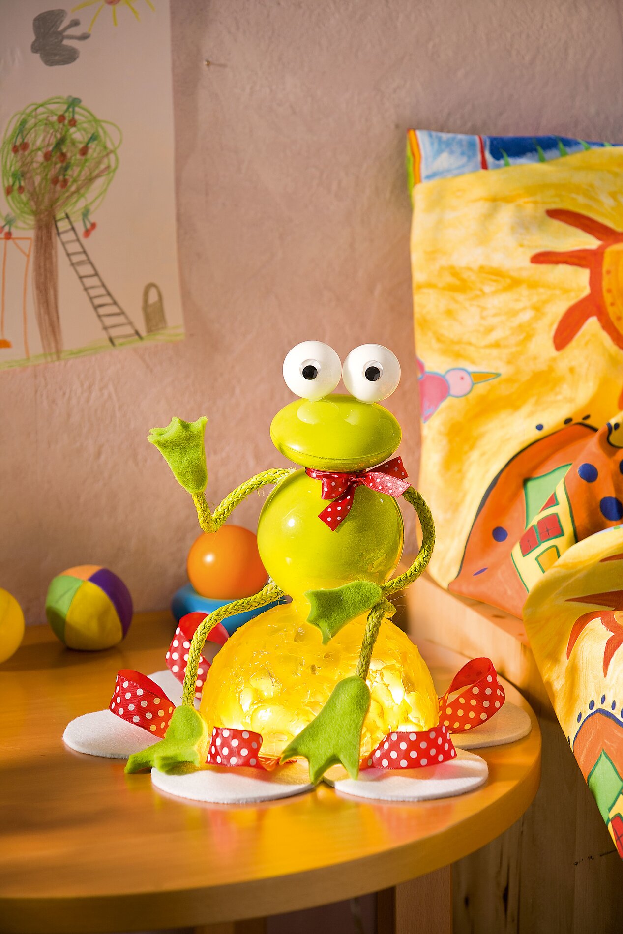 Pro ruce a nohy použijte tavnou lepicí pistoli, kterou roztavte otvory ve středové kouli, otřepte a přilepte figurkový drátek. Přilepte ruce a nohy, velkou kouli připevněte k plstěnému květu pomocí řezacího kotouče a smyček z tečkované stuhy. Nakonec přilepte parukářské oči a pod velkou polokouli umístěte šňůru LED světel.