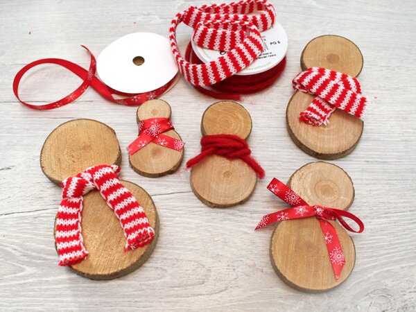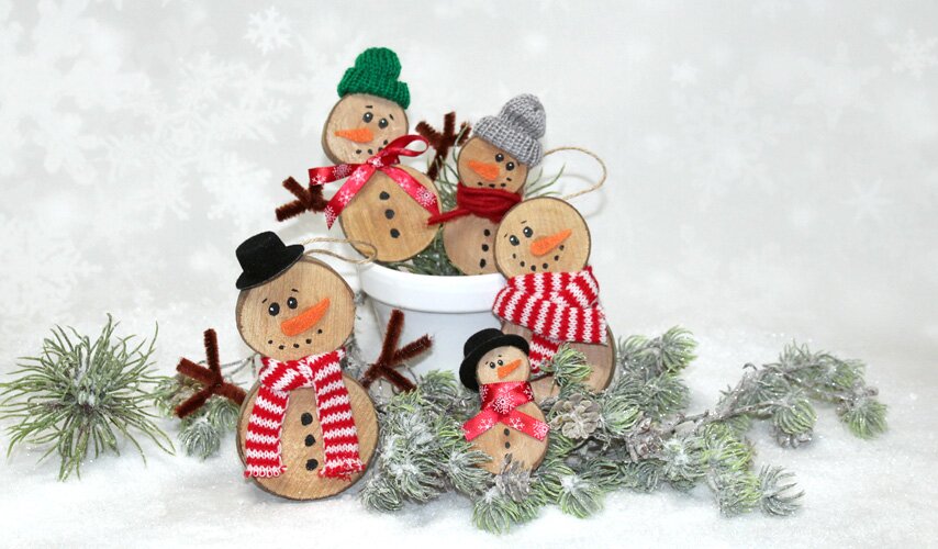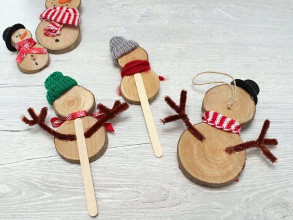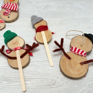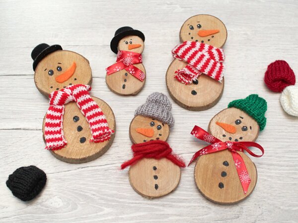 Z plsti vystřihněte malé nosy a nalepte je. Sněhulákům můžete kolem nosu namalovat obličeje a na břicho uhlíky. Po zaschnutí barvy připevněte klobouky a čepice k hlavě pomocí horkého lepidla. Ze žinylkového drátu ustřihněte dlouhý a krátký kousek. Krátký kousek obtočte kolem delšího a nechte mezi nimi trochu místa. Takto postupujte tolikrát, kolikrát budete potřebovat ruce pro sněhuláky, a přilepte je na záda.