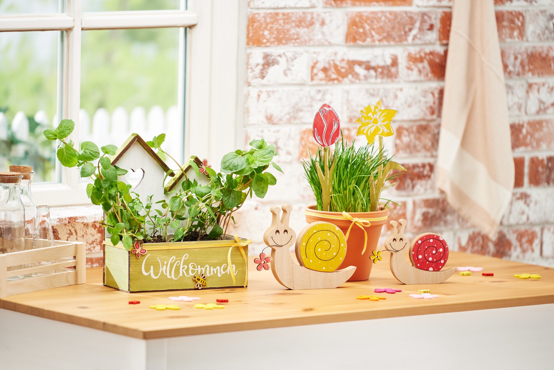 Nejprve nabarvěte dřevěnou misku na rostliny, šneky VBS, dřevěné zátky VBS a některé rozptýlené části mořidlem na dřevo. Před pokračováním nechte barvu zcela zaschnout.