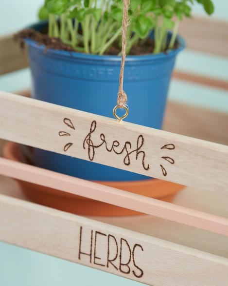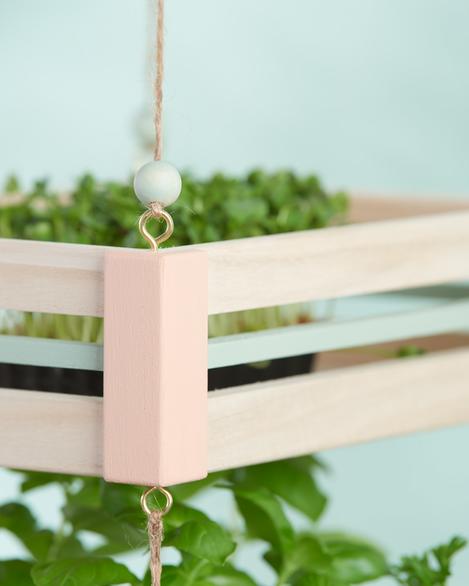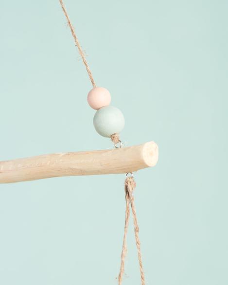 Poté přivažte sisalový provázek ke každému očku malé bedny. Na každou šňůrku navlékněte 1 dřevěnou kuličku, stuhy navlékněte na levé očko větvičky a všechny čtyři nitě svažte na uzel.