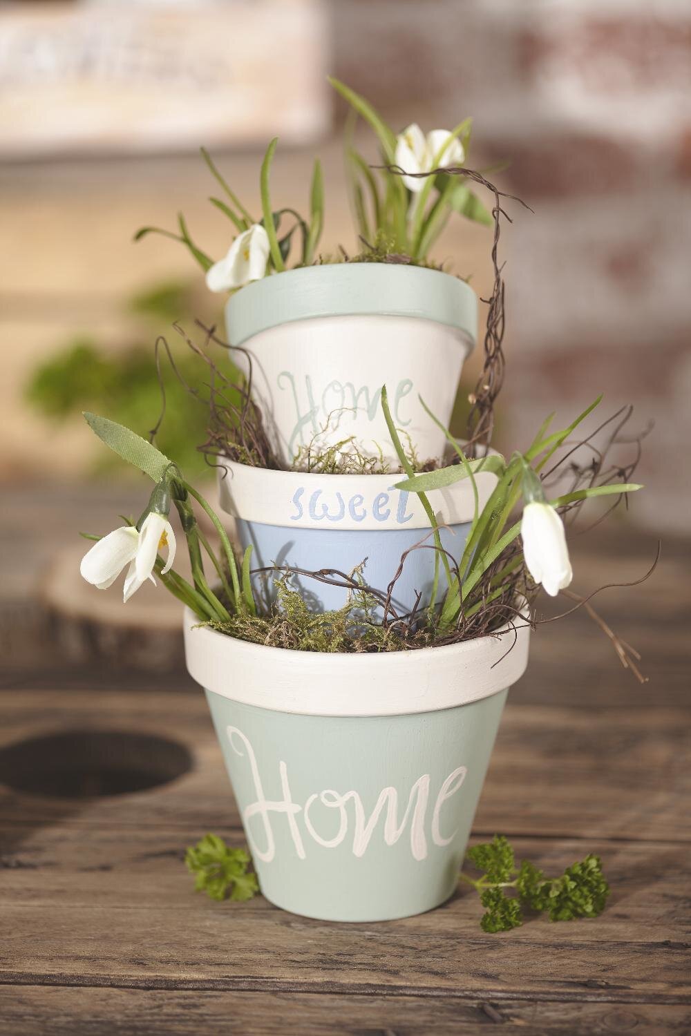 Květináče se naskládají na sebe pomocí dřevěné kulaté tyčky. Kulatá tyčka Ø 10 mm se nařeže na délku přibližně 17 cm a prostrčí se květináči. Ty se nyní mohou naplnit dekorativní vrbou a mechem a nakonec ozdobit sněženkami.